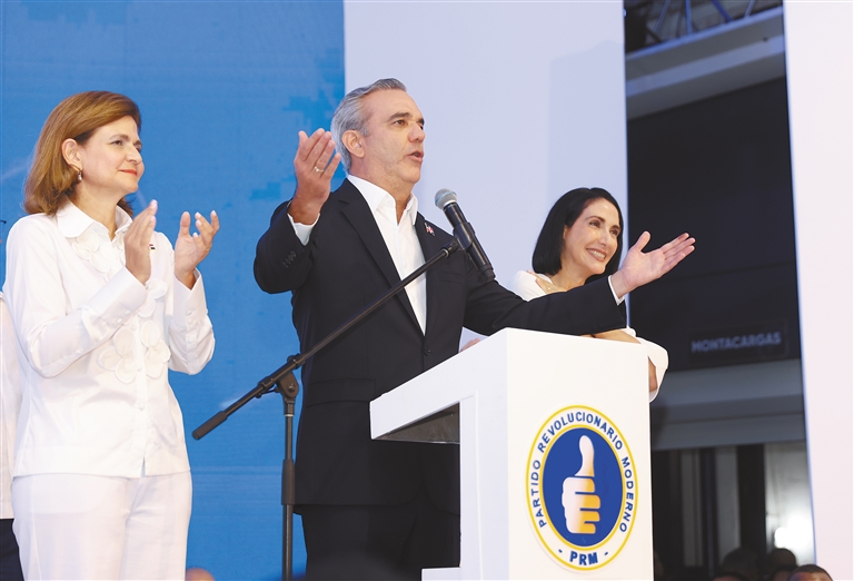 多米尼加现任总统、现代革命党候选人阿比纳德尔19日晚在竞选总部宣布,他在当天举行的总统选举首轮投票中获胜,成功连任。 图为5月19日,在多米尼加首都圣多明各,阿比纳德尔(中)在竞选总部发表胜选演讲。新华社记者 李梦馨 摄