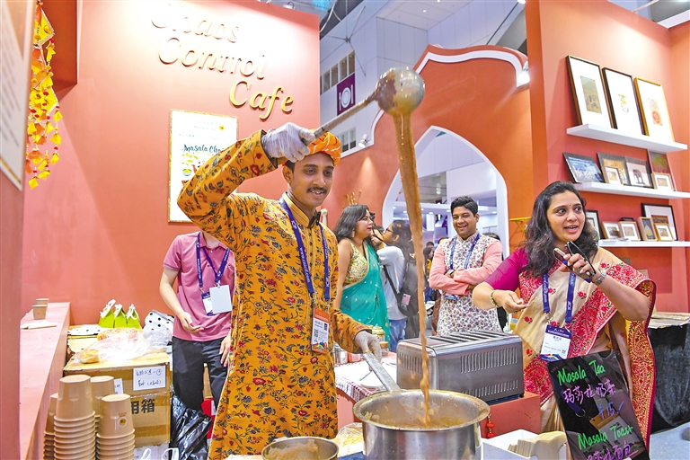 图为5月24日,在第二十届中国(深圳)国际文化产业博览交易会印度展台,参展商展示印度玛莎拉奶茶。