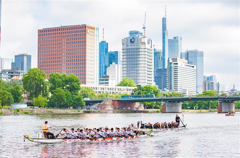 图为5月25日,在德国法兰克福,龙舟队伍在美因河上参加比赛。新华社记者 张帆 摄