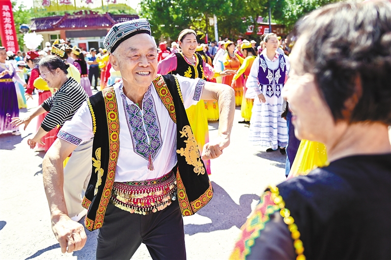 6月4日,一年一度的“千人共跳民族舞”主题活动在新疆塔城地区乌苏市甘河子镇拉开帷幕,迎接中国传统节日端午节的到来。图为在甘河子镇“千人共跳民族舞”主题活动现场,各族群众共跳民族舞。新华社记者 丁磊 摄