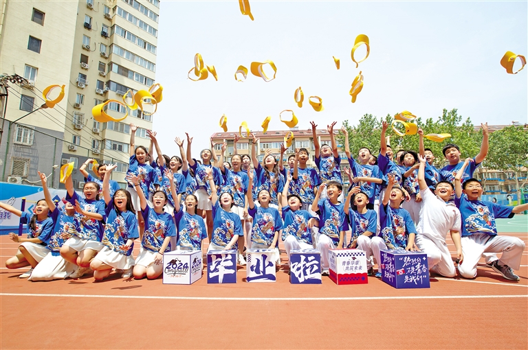 进入6月,学校迎来毕业季,毕业班的学子们在校园内一起拍摄毕业照,记录自己的校园时光。图为6月4日,北京小学六年级学生拍毕业照留念。新华社记者 徐金泉 摄