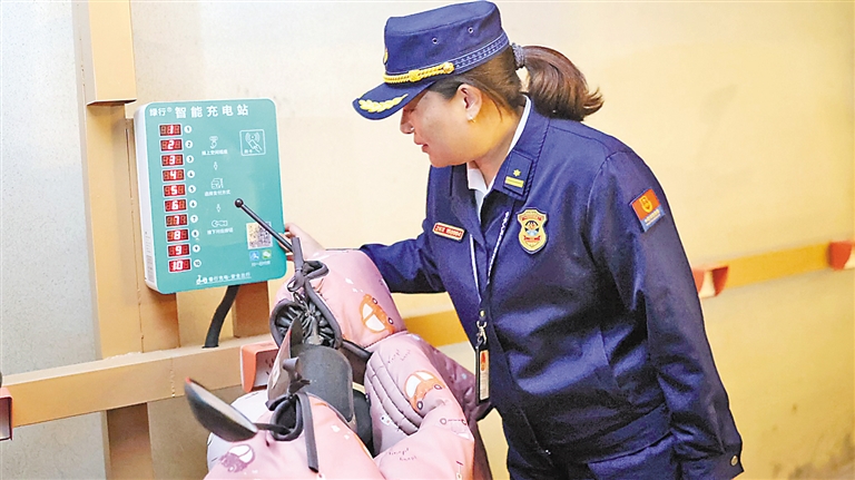 山南市消防救援支队指战员深入住宅小区,检查电动自行车规范停放处的智能充电装置。