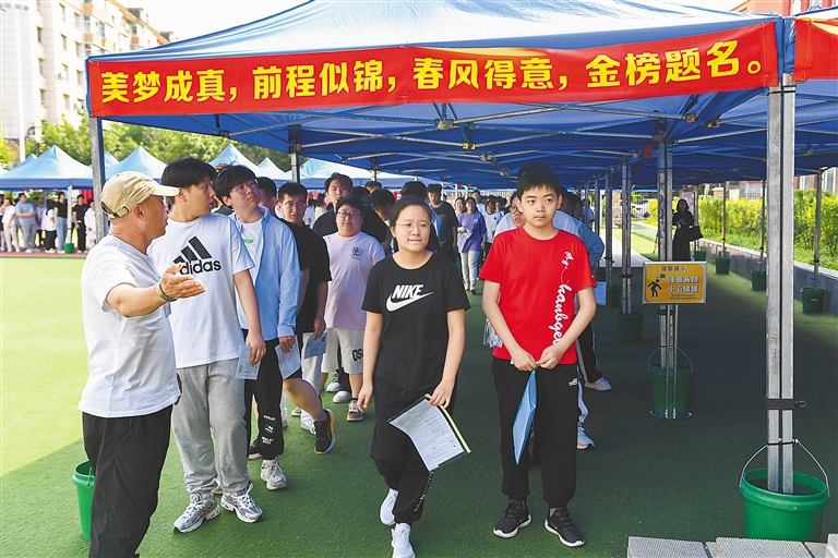 2024年高考即将拉开帷幕,各地考生提前来到考点,熟悉考场环境,从容应考。 图为6月6日,考生们排队进入长春市第一〇三中学校考点。 新华社记者 张楠 摄