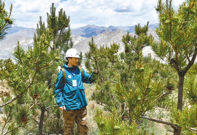 工程的绿意还延伸至拉萨贡嘎机场周边的山体,山南市林草局林业和草原有害生物防治站检疫员次仁罗布在造林现场进行苗木复检工作,复检结果显示这批苗木的成活率达到92%。“这里是走出贡嘎机场的第一站,旅客们可以直接看到我们种下的绿色,很有意义。”次仁罗布说。