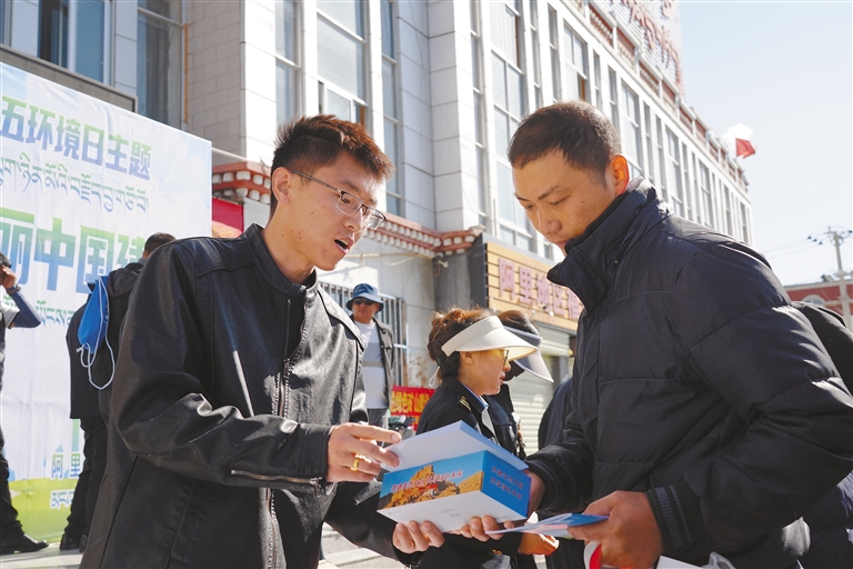 阿里地区生态环境局噶尔县分局工作人员在向过往群众普及环境保护知识。 本报记者 洛桑旦增 达珍 摄