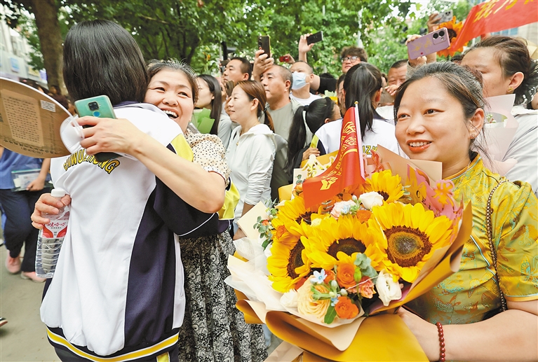 ?图为6月9日,在河北省石家庄市第一中学考点,考生家人与考生相拥。