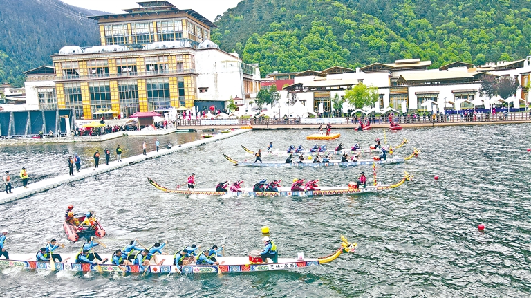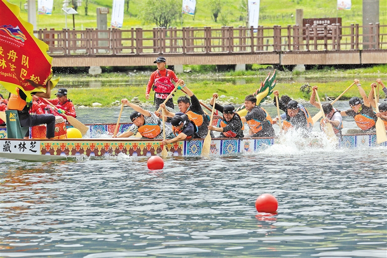 6月10日,2024年西藏林芝南迦巴瓦高原体育大会鲁朗中尼高原龙舟友谊赛精彩上演。来自尼泊尔、新加坡和北京市、云南省以及拉萨市、林芝市等多地的8支龙舟队,百余名运动员奋力挥桨、激流勇进,为广大群众和游客献上了一场水上竞技的“大餐”。