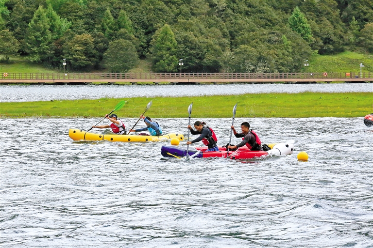 图为:选手正在进行200米静水皮筏艇比赛。 本报记者 谢筱纯 摄