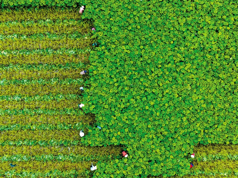 图为6月17日,浙江省湖州市吴兴区埭溪镇上强村村民在收割蜂斗菜(无人机照片)。 新华社发(何伟卫 摄)