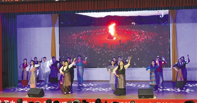 近日,一场以“汉藏一家亲·共筑靖曲情”为主题的文艺联谊演出在江苏省靖江市斜桥镇中心小学举行。图为在斜桥镇参加技能培训的拉萨市曲水县学员为现场观众献上精彩的表演。本报记者 格桑伦珠 摄