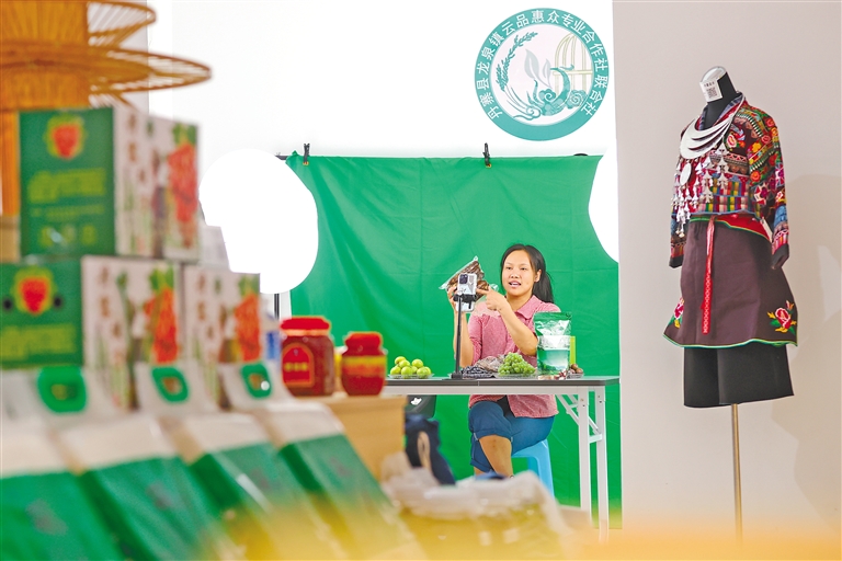 图为6月18日,电商主播在贵州省丹寨县龙泉镇云品惠众专业合作社联合社的电商直播间售卖产品。 新华社发