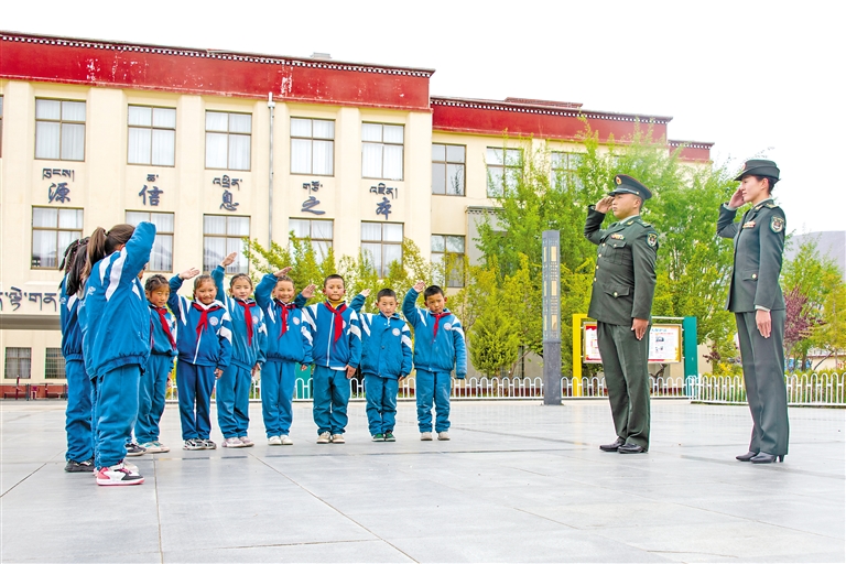 近日,驻藏某部与驻地学校联合举办“大手拉小手、共筑国防线”活动。该部两名标兵站上讲台,分别结合自身参军入伍、出国比武、戍边卫国等经历,向学生讲述强军故事。 图为官兵与学生互相敬礼,传递青春力量。 曾庆明 毛露 许正磁 摄