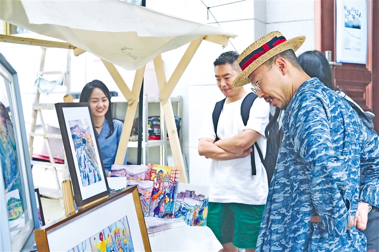 hima hima 隙马画廊举行“甜茶馆青年艺术季·吉吉集市”,这是市民在观赏艺术作品。