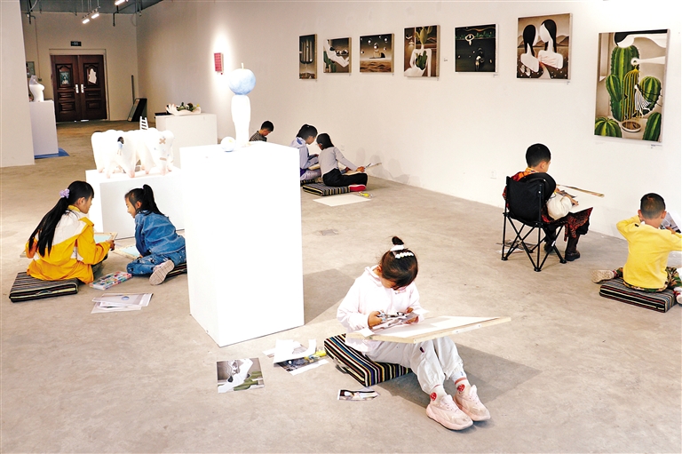 “假如我是艺术家”少儿艺术实践活动现场。该活动通过介绍艺术专业分工、展览导览、指导老师授课、小朋友实地创作及交流分享等环节鼓励孩子们不受限制地探索艺术的世界。