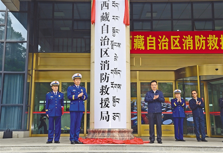 6月18日上午,自治区党委书记王君正前往自治区消防救援总队调研。这是王君正为西藏自治区消防救援局揭牌。本报记者 旦增西旦 摄