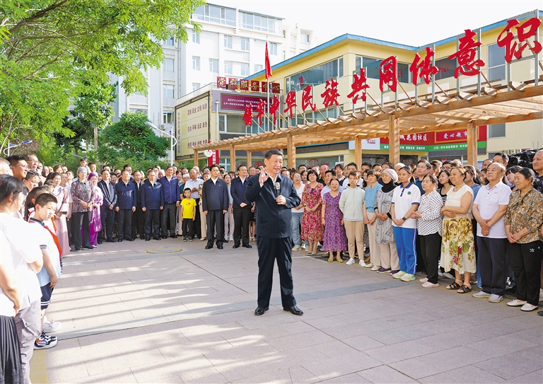 傍晚时分,社区广场十分热闹,居民们看见总书记来了,纷纷围拢过来,热烈鼓掌欢迎。习近平亲切地对大家说,时隔4年,我再次来宁夏看望各族干部群众,见到大家非常高兴!中华民族是一个大家庭,各族人民要像石榴籽一样紧紧抱在一起。要不断铸牢中华民族共同体意识,把各族人民的心紧紧连在一起,把各方面的力量广泛凝聚到一起,共同推进中国式现代化,共襄中华民族伟大复兴的盛举。