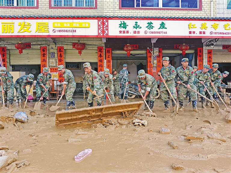 图为6月20日,福建省军区龙岩军分区民兵在龙岩市上杭县蓝溪镇进行清扫淤泥工作。