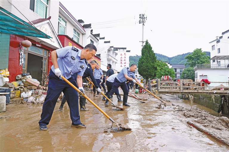 图为6月21日,在黄山市歙县绍濂乡绍濂村,歙县公安局民警在清扫过水路面。