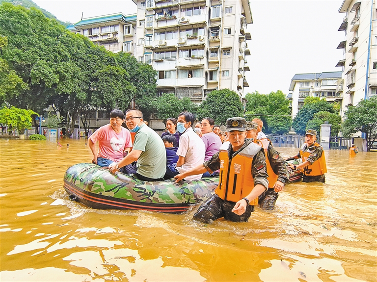 图为6月19日,武警广西总队桂林支队官兵在桂林市南溪山医院转移受困群众。
