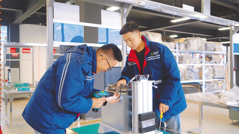 在西藏清匠电器科技有限公司生产车间,来自多颇章乡嘎东团结新村六组村民朗嘎崔成正和与他一同入职的员工学习安装制氧机。2023年大学毕业以来,朗嘎崔成一直待业,偶尔打零工补贴家用,今年3月,嘎东团结新村就业服务站为他争取了这个就业岗位。