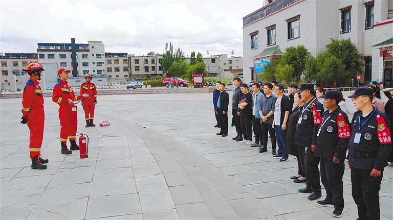 在消防队员的指导下,保安人员进行灭火实操。本报记者 旦增嘎瓦 摄