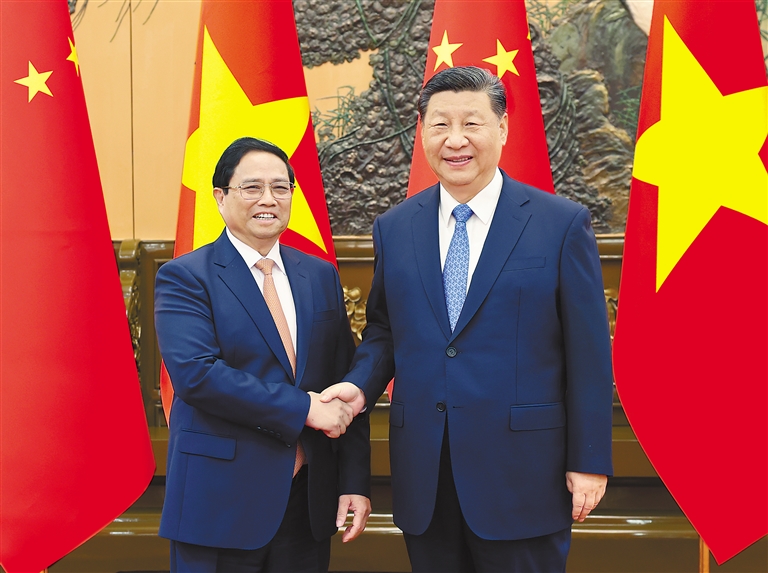 习近平请范明政转达对阮富仲总书记和苏林国家主席的诚挚问候。习近平指出,去年年底我访问越南期间,同阮富仲总书记宣布构建具有战略意义的中越命运共同体,引领两国关系进入新阶段。半年多来,两党两国高层交往密切,各领域合作进展顺利,给两国人民带来实实在在的利益。当前,世界百年变局加速演进,中越保持经济快速发展和社会长期稳定,彰显了社会主义制度的优越性。构建具有战略意义的中越命运共同体,符合两国各自现代化建设需要,有利于维护地区和平稳定,促进世界社会主义事业发展。中方愿同越方加强战略引领,围绕“六个更”总体目标,坚持团结友好,坚定相互支持,深化互利合作,携手迈向现代化,为世界和平、稳定、发展、繁荣作出更大贡献。