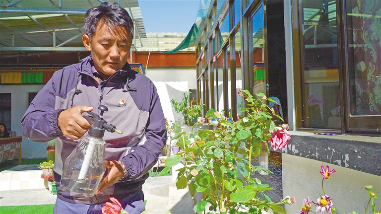 河北省援藏工作队依托古格王国景区的区位优势打造了札布让旅游小康示范村,通过发展民宿经济,让当地村民吃上了“旅游饭”。 图为札布让村村民次仁多杰在打理家庭旅馆内的花草。