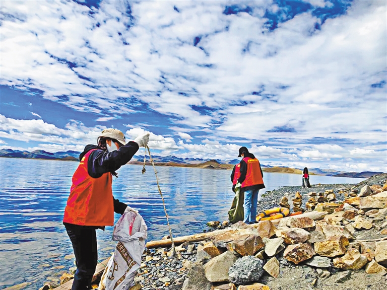 图为浪卡子县干部群众在清理羊湖沿岸垃圾。
