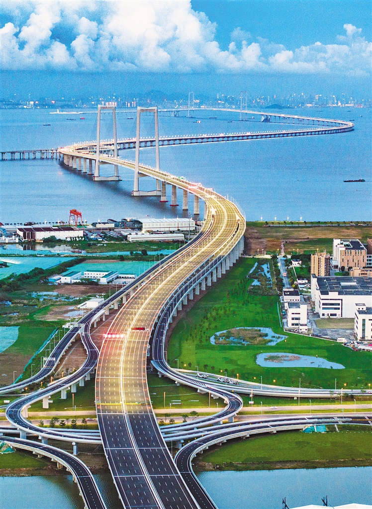 6月30日,历时七年建设的国家重大工程深中通道正式通车试运营,从深圳到中山的车程从原来的2小时缩短至30分钟。深中通道是环珠江口“A”字形交通网络骨架的关键“一横”,跨越伶仃洋,让“深莞惠”与“珠中江”两大城市群实现了跨海直连。深中通道全长约24公里,集“桥、岛、隧、水下互通”于一体,是世界上综合建设难度最高的跨海集群工程之一。