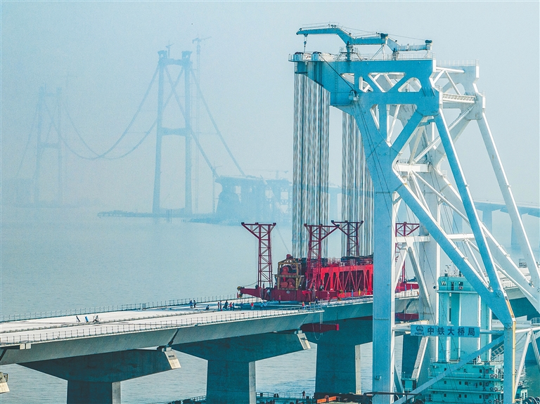 2022年11月10日,“天一号”运架一体船在吊装深中通道非通航孔道的最后一片混凝土梁(无人机照片)。新华社发