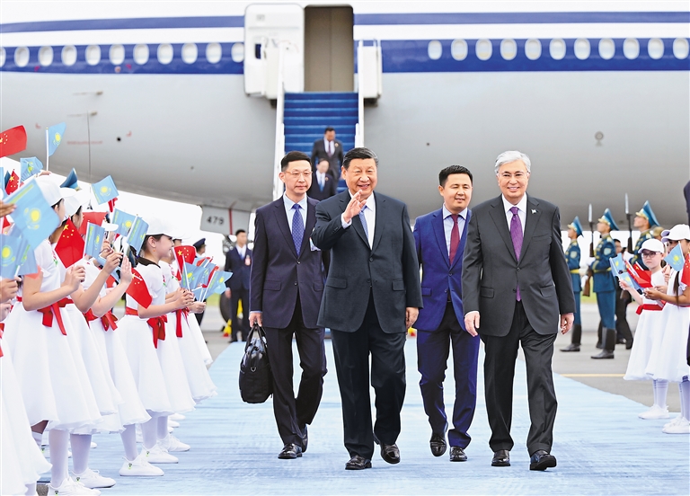 专机抵达阿斯塔纳纳扎尔巴耶夫国际机场时,哈萨克斯坦总统托卡耶夫率政府第一副总理斯克利亚尔、副总理兼外长努尔特列乌、总统外事顾问卡济汉、阿斯塔纳市长卡瑟姆别克等高级官员热情迎接。身着盛装的哈萨克斯坦女青年向习近平献花。