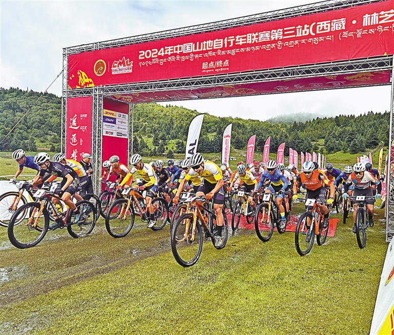 近日,2024年中国山地自行车联赛第三站(西藏·林芝)在林芝市比日山国家森林公园天边牧场举行。来自全国各地的16支专业代表队,以及业余选手、自行车爱好者们一同角逐竞技。