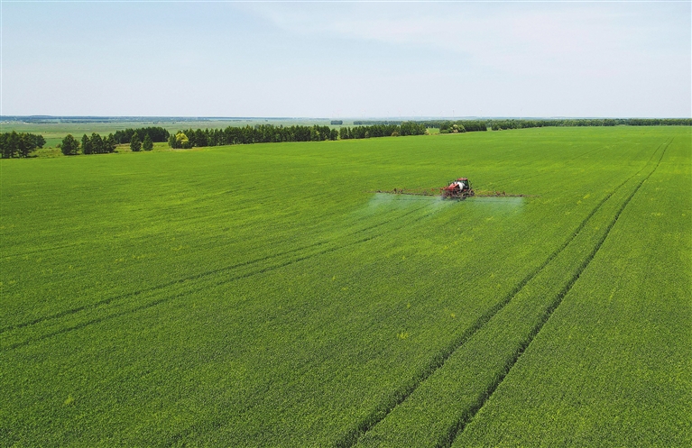 黑龙江省北大荒集团各农业生产单位抢抓小麦扬花期,利用大型机车对有机麦田进行施肥作业,以提高作物品质和抗病能力。图为北大荒集团红星农场有限公司一块有机麦田,大型机车在进行喷施生物液肥作业(无人机照片)。新华社发(侯越 摄)