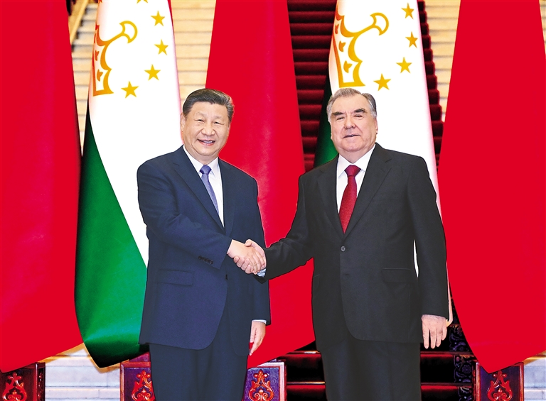 习近平指出,中国和塔吉克斯坦山水相连、唇齿相依、命运与共。两国关系具有深厚的历史渊源、坚实的政治基础、丰富的合作内涵、广泛的民意支持。在双方共同努力下,两国政治互信持续深化,共建“一带一路”合作成果丰硕,一系列重大项目进展顺利,有力促进了两国共同发展。去年,你对中国进行国事访问,我们决定致力于构建世代友好、休戚与共、互利共赢的中塔命运共同体。新形势下,中方愿同塔方发展新时代中塔全面战略合作伙伴关系,在更高起点上构建中塔命运共同体,助力两国发展振兴。