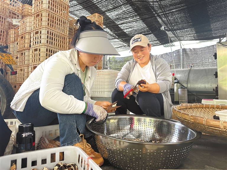 图为格当乡尼日卡林下资源合作社员工对灵芝进行加工。