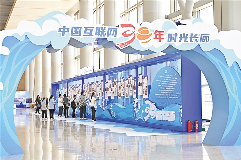 图为与会者在大会展览展示区设置的中国互联网30年时光长廊内参观。新华社记者 李鑫 摄