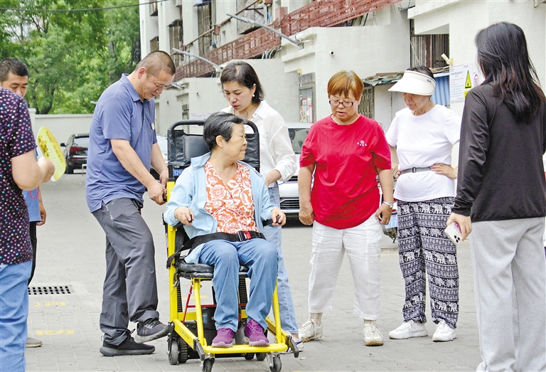 7月11日,北京市朝阳区青年路社区联合绿芽公益机构在辖区内的无电梯老旧楼房小区内配备“爬楼机”,以解决小区内高龄老年人、卧床病人出行等难题。