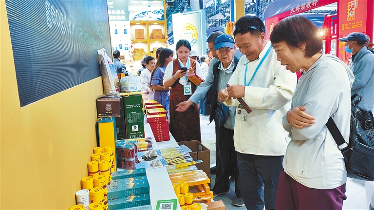 图为西藏展馆内,游客咨询、购买商品。