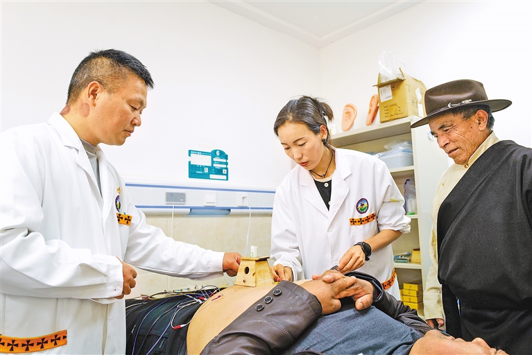 图为在昌都市察雅县藏医院,重庆市大足区人民医院援藏医生(左)与藏医院医生结合中医与藏医疗法,为患者进行诊治。 本报记者 丹增群培 摄