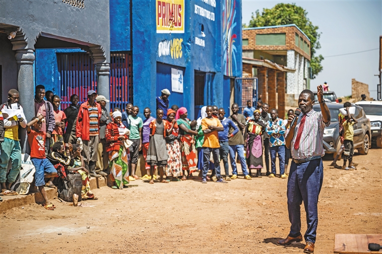 卢旺达大选将于7月15日举行。 图为7月13日,在卢旺达吉昆比,独立候选人菲利普·姆帕伊马纳(右一)进行竞选演讲。新华社记者 王冠森 摄