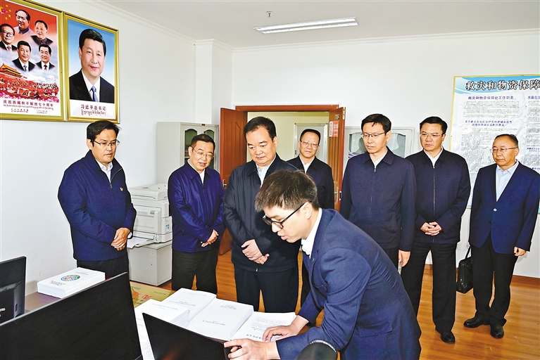 7月29日上午,自治区党委书记王君正到应急管理系统调研。这是在自治区应急管理厅综合减灾救灾和物资保障处,王君正了解相关工作情况。 本报记者 旦增西旦 摄