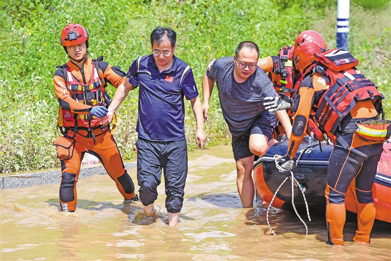 吉林省消防救援总队调集长春、吉林、白山等地4个支队上百名消防救援人员投入到临江市受灾严重地区,进行抢险救援、人员转运、运送补给、排涝清淤等工作。 图为7月29日,在吉林省临江市,消防救援人员转运受困群众。 新华社记者 张楠 摄
