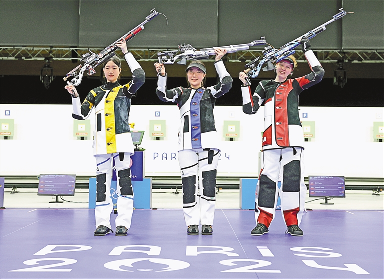 7月29日,在法国沙托鲁举行的巴黎奥运会射击女子10米气步枪决赛中,韩国选手潘秀珍获得冠军,中国选手黄雨婷获得亚军,瑞士选手戈尼亚特获得季军。图为中国选手黄雨婷(左)在赛后。新华社记者 张帆 摄