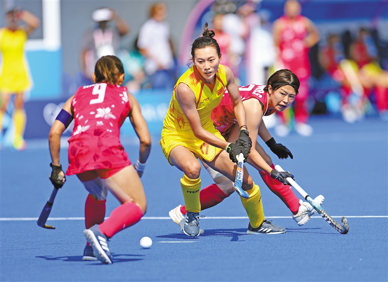 7月29日,在巴黎奥运会曲棍球女子小组赛A组比赛中,中国队5比0战胜日本队。图为中国队球员但文(中)在比赛中拼抢。新华社记者 任鹏飞 摄