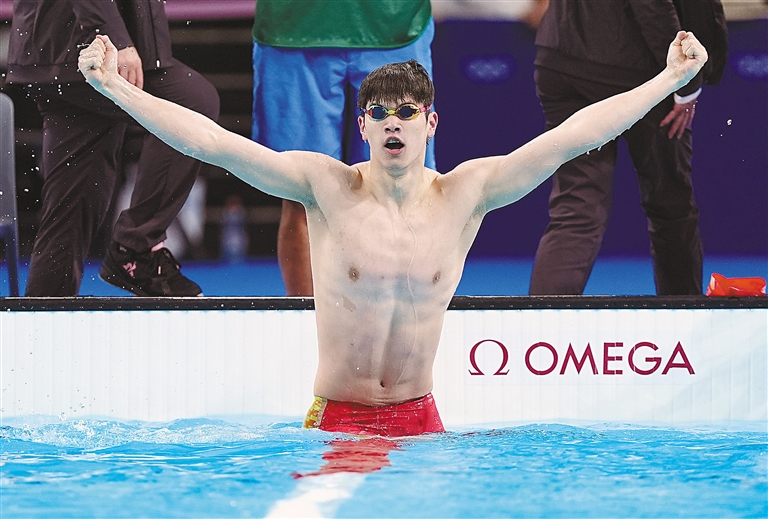 图为7月31日,中国选手潘展乐在比赛后庆祝。 新华社记者 杜宇 摄