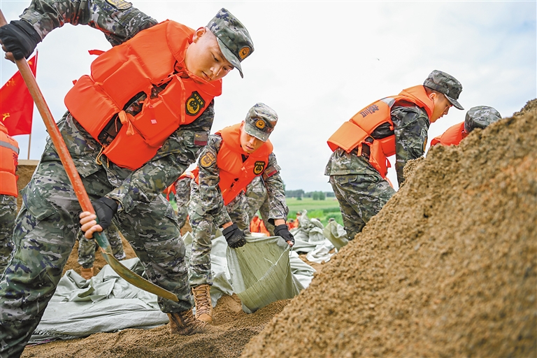 图为8月2日,武警内蒙古总队通辽支队官兵在东辽河大堤上装沙袋封堵渗漏点。