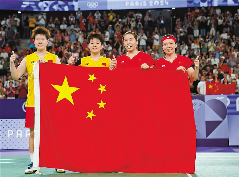 8月3日,在巴黎奥运会羽毛球项目女双决赛中,两对中国组合展开较量。最终,陈清晨/贾一凡2比0战胜刘圣书/谭宁,夺得金牌。