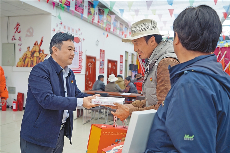近日,那曲市民委以理论政策传基层、走访调研入基层、信访接待下基层、现场办公到基层、挂点帮扶新时代文明实践工作为活动内容,在索县举行《习近平谈治国理政》第四卷藏文版赠书仪式及送宣讲、送健康、送礼物等相关活动。 图为那曲市民委相关工作人员在捐赠书籍。 本报记者 曲珍 本报通讯员 益西卓嘎 摄