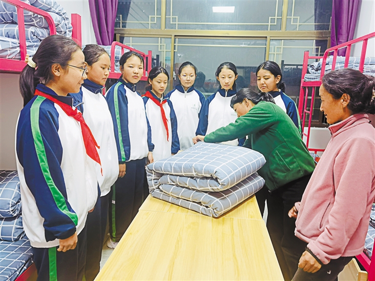 图为拉萨北京实验中学教师指导新生整理被褥。本报记者 央金 摄