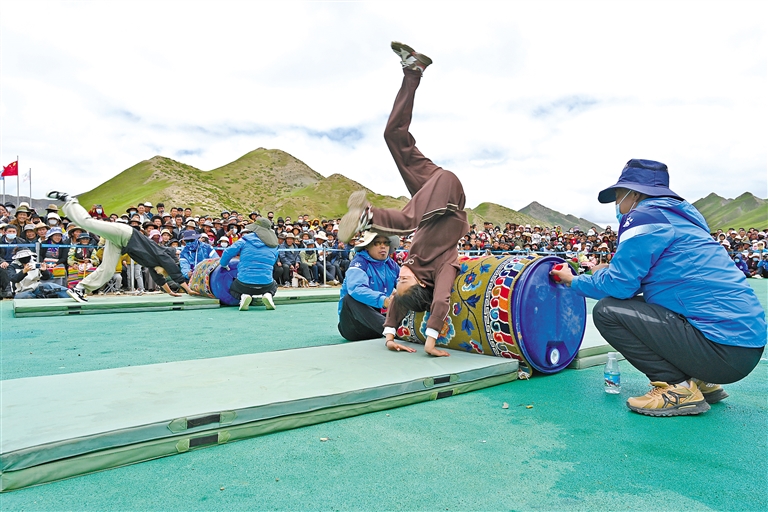 图为昂仁县农牧民运动会“翻滚桶”比赛现场。本报记者 扎西顿珠 摄